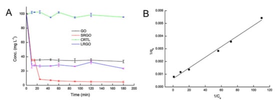 (A) Time-dependent adsorption of dye acridine orange by GO, in-situ reduced GO(SRGO), three-hour-long pre-reduced GO (LRGO) versus the blank group, AO ~100 mg/L, 50 mL; (B) Adsorption isotherms fitted by the Langmuir model: the reciprocal of equilibrium concentration versus that of equilibrium capacity. Adapted with permission from [99]. Copyright Elsevier, 2012.