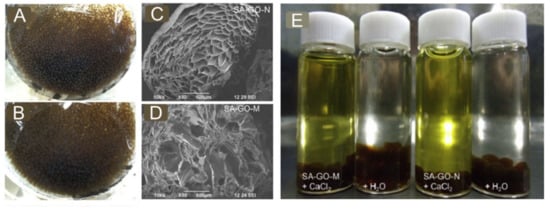 (A) Ca2+ cross-linked GO-alginate composite beads(SA-GO-N); (B) Acid-gelled GO-alginate composite beads (SA-GO-M);(C) a SEM image of freezing-dry bead SA-GO-N; (D) a SEM image of the bead SA-GO-M; (E) naked-eye comparison of color changes upon dye-adsorbing beads (SA-GO-M and SA-GO-N) were immersed in the CaCl2 ~0.5 mol/L solution and deionized water. Adapted with permission from [119]. Copyright Elsevier, 2014.