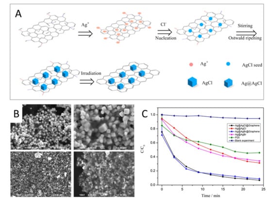 In addition to the direct adsorption effect on the various contaminants, the emergence of GO has received extensive attention and shows great potential as additional yet determinative agent/template in the formation of photocatalyst single crystals. During this process, GO can selectively control the growth direction of inorganic nanoparticles owing to the intrinsic hydroxyl, epoxy and carboxylic functional groups, which could act as active anchoring sites for the heterogeneous nucleation of metal ions such as Au3+, Ag+, Ti3+, Zn2+, Ca2+, etc. [128,129]. Wang et al. prepared new cubic Ag@AgX@Graphene (X = Cl, Br) nanocomposites by a GO sheet-assisted assembly protocol, where GO sheets act as a novel amphiphilic template for hetero-growth of AgX nanoparticles (Figure 11A). Morphology transformation of AgX nanoparticles from sphere to cube-like shapes was accomplished by involving GO (Figure 11B). Functional groups containing the hydroxyl, epoxy and carboxylic groups could act as active anchoring sites for heterogeneous nucleation of Ag+ ions [130]. The resultant cubic Ag@AgX@Graphene (X = Cl, Br) nanocomposites exhibit enhanced adsorption capacity, and reinforced electron-hole pair separation in the decomposition of AO dye (Figure 11C). After that, tetrahedral Ag3PO4 crystals with morphology transformation from rhombic dodecahedrons has been also confirmed by the hybridization with GO sheets [131]. GO incorporated polymers such as poly (vinyl alcohol) (PVA) has been studied by our group. The role of GO contribute not only the enhancing the mechanical properties but also adjusting the morphology and the porous structure [132,133]. During the hybridization, GO or graphene for this kind of photocatalyst needs to be arranged in a single-layered and/or few-layered manner, otherwise it is not possible to obtain the enhancing efficacy [134].