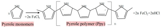 Subsequently, 10 mL of completely dissolved FeCl3·6H2O (3.0 g) was slowly added. The system reacted with mechanical stirring for 4 h. The Resulting product (CoFe2O4@SiO2-Ppy) was rinsed 3 times and then desiccated at 338 K. The formation scheme of the pyrrole polymer is shown in Figure 1.