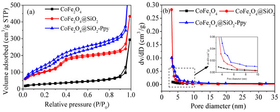 A noteworthy point is that the BET value of CoFe2O4@SiO2-Ppy is reduced compared to CoFe2O4@SiO2. This owes to the fact that lots of the chain-like Ppy packed on the surface of the material and sealed the porous mesh structure of the material during the continuous process of polymerization [22].