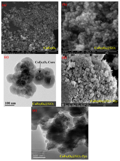 As shown in Figure 3b, the size of CoFe2O4@SiO2 becomes larger compared to CoFe2O4, proving that the silicon shell has successfully loaded on the surface of CoFe2O4 nanoparticles. However, most of the particles are still stuck together, resulting in a poor dispersibility. As shown in Figure 3c, the agglomeration of CoFe2O4@SiO2-Ppy decreases significantly, and it can be clearly observed that the material has a smooth surface and a ball-like shape. From the TEM image of CoFe2O4@SiO2-Ppy shown in Figure 3d, it can be judged by different electron penetration: the black core is CoFe2O4; the lighter shell is a silicon shell (SiO2 layer) and Ppy. The above results suggest that CoFe2O4@SiO2-Ppy has a core–shell structure and that CoFe2O4@SiO2 has been enclosed into the Ppy matrix [24].