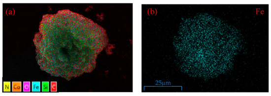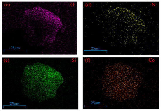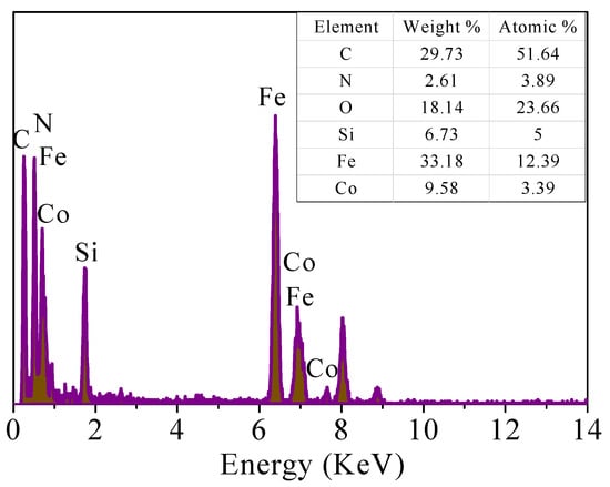 As shown in Figure 4, the EDS elemental analysis of CoFe2O4@SiO2-Ppy shows the peaks of Co, Fe, C, Si, and N and indicates the major constituents of magnetite, silice shell, and Ppy, which verifies the existence of CoFe2O4, silice shell (SiO2 layer), and Ppy. From Figure 5a–f, the material mainly contains Fe, N, O, Si, and Co. It shows that Ppy was successfully combined with CoFe2O4@SiO2 and evenly distributed on the outer surface.