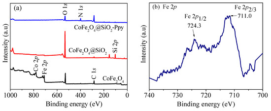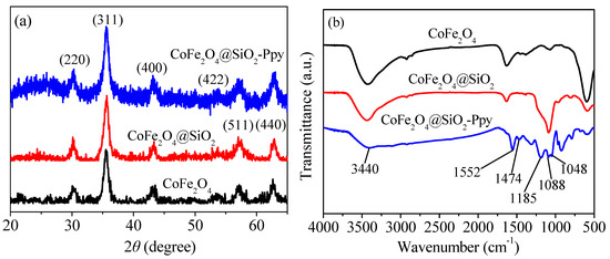 No new peaks indicate that the crystal form of the material is not be affected by the modification. In the pattern of CoFe2O4@SiO2-Ppy, there is a wide peak at 2θ of about 25°, which is the characteristic peak of Ppy [26,27], probably due to a certain level of Ppy crystallization.