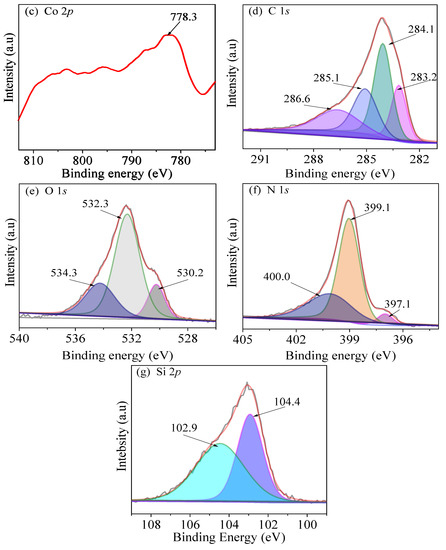 From the wide-scan XPS spectra shown in Figure 8a, it can be seen that there are six peaks at 110.1, 293.7, 405.4, 541.2, 738.2, and 813.9 eV, attributed to Si 2p, C 1s, N 1s, O 1s, Fe 2p, and Co 2p, respectively. In the pattern of CoFe2O4@SiO2, the peaks of Co, Fe, and C become weak and a new peak of Si 2p appears at 110.1 eV.