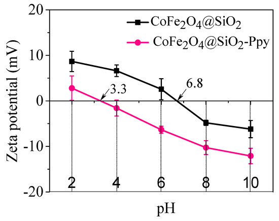 After grafting with Ppy, the value of pHzc of CoFe2O4@SiO2-Ppy is decreased to 3.3, which owes to the existence of -NH2 [38], proving a successful synthesis of CoFe2O4@SiO2-Ppy. In addition, the Zeta potential of CoFe2O4@SiO2-Ppy is −12.1 mV at pH 8, which is far lower than that of CoFe2O4@SiO2 of −6.2 mV. The result reveals that the solution of CoFe2O4@SiO2-Ppy is relatively stable, which is consistent with the data shown in Figure 3c. The results of low Zeta potential value and good stability are conducive to alleviating the agglomeration of adsorbent solution and enhancing the removal ability for positively charged Hg2+ ions.