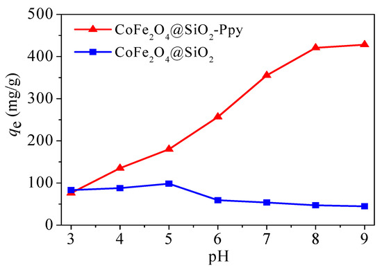 It is well known that pH can affect the surface charges of adsorbents and the form of heavy metals [39]. As shown in Figure 10, CoFe2O4@SiO2 has low adsorption capacity for mercury ions, only 98.4 mg/g at pH = 5. Compared to CoFe2O4@SiO2, the adsorption capacity of CoFe2O4@SiO2-Ppy is greatly enhanced, and the adsorption plot has a rapid ascending tendency with the increasing pH. A basic equilibrium adsorption is reached at pH = 8 and achieves 420.8 mg/g. Therefore, pH = 8 was chosen as the reaction condition in later study.