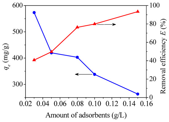 The capacity and efficiency (E) were investigated by changing the dosage of CoFe2O4@SiO2-Ppy of 3, 5, 8, 10, and 15 mg with 100 mL 40 mg/L Hg2+ solution. As illustrated in Figure 11, as the dosage increases, the adsorption capacity shows a downward trend, but the removal efficiency increases. The dosage of 0.05 g/L is selected for subsequent test conditions.