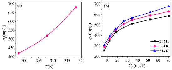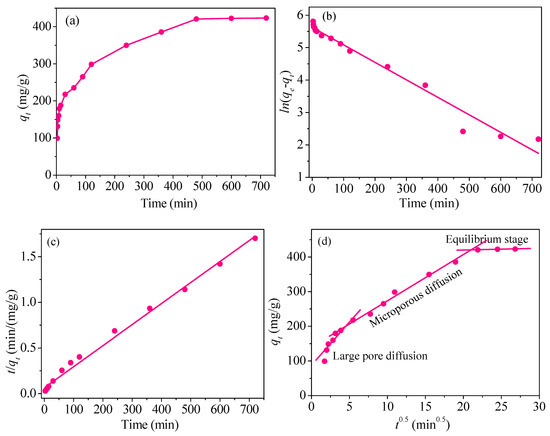 Regression coefficient (R2) in Figure 12b,c shows that pseudo-second-order fitting has a higher R2 compared with pseudo-first-order fitting with R2. Moreover, according to the calculated adsorption capacity (qe,cal) in Table 2, the qe,cal in the pseudo-first-order fitting and pseudo-second-order fitting are 277.2 mg/g and 434.8 mg/g, respectively. The latter value is closer to the value qe,exp of 420.8 mg/g, indicating that pseudo-second-order fitting is more consistent with the adsorption process.