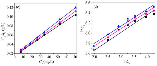 The adsorption process was fitted by the intraparticle diffusion model and plotted in Figure 12d. From Figure 12d, the adsorption process consists of three different adsorption phases: large pore diffusion phase, microporous diffusion phase, and equilibrium adsorption phase. At the first phase, the adsorption rate is the fastest; at the second phase, the rate becomes relatively slow, and tends to be gentle at the final phase of adsorption.