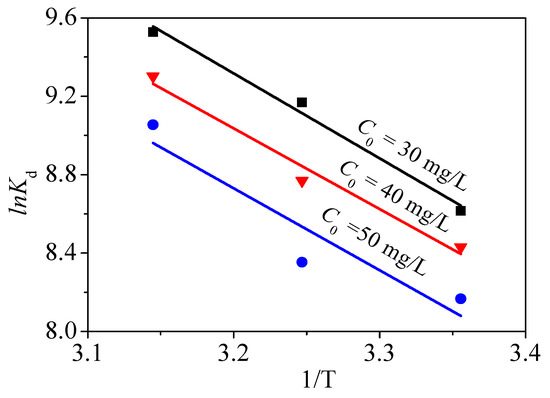 here, R is 8.314 J/(mol·K). Kd represents thermodynamic constant. Data obtained by lnKd versus 1/T is plotted and fitted to calculate ΔH0 and ΔS0 based on the slopes and intercepts of fitted plot. The results are exhibited in Figure 14 and Table 5.