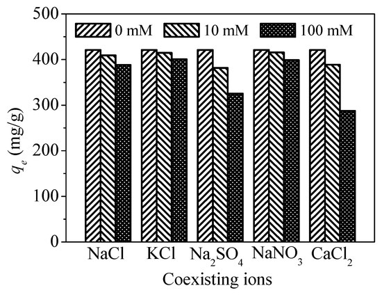 Among these cations (Na+, K+, Ca2+), Ca2+ generates a large influence on the adsorption, and the capacity for Hg2+ removal is reduced by 13.12% and 31.73% at the concentrations of 10 mM and 100 mM, respectively. It may be because Ca2+ is a divalent cation and occupies two active adsorption sites [49].