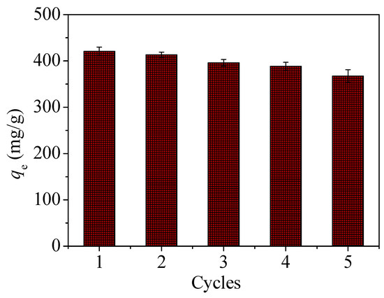 It can be seen from the above experiments that changes in pH significantly affect the adsorption process of CoFe2O4@SiO2-Ppy for Hg2+. As pH increases, the adsorption capacity increases in the pH range 3–9. Thus, the desorption of CoFe2O4@SiO2-Ppy can be achieved by pickling with an acidic solution [48]. 0.005 g of CoFe2O4@SiO2-Ppy was first contacted with 100 mL Hg2+ solution (40 mg/L) for 8 h at 298 K. The resulting Hg2+-adsorbed CoFe2O4@SiO2-Ppy composite was filtered and then eluted with 100 mL 0.2 mol/L HCl solution. The whole process was repeated 5 times. The experimental results are exhibited in Figure 16.
