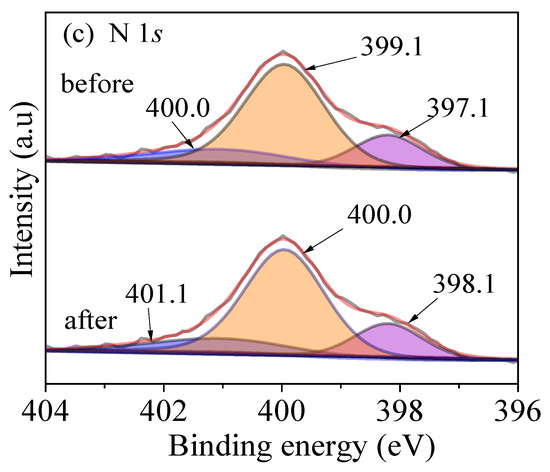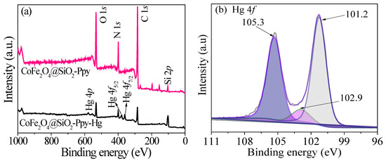 Figure 17a shows the XPS patterns of CoFe2O4@SiO2-Ppy. After adsorption, the intensities of C 1s, N 1s, O 1s, and Si 2p in CoFe2O4@SiO2-Ppy-Hg are reduced and new Hg 4f and Hg 4p appear. There are two peaks at 101.2 and 105.3 eV in Figure 17b, attributed to Hg 4f5/2 and Hg 4f7/2, respectively, and another peak at 102.9 eV is Si 2p [13]. In Figure 17c, due to the adsorption of Hg2+, the whole of the N peak is shifted and the shifted value is approximately at 1 eV [52].