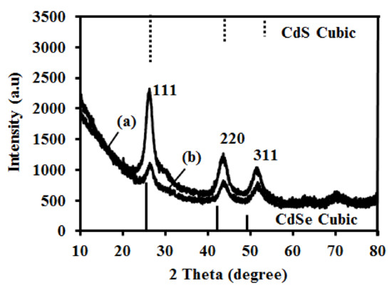 PXRD of as- synthesized QDs: (a) CdSe QDs and (b) CdSe(S)/ZnO QDs.