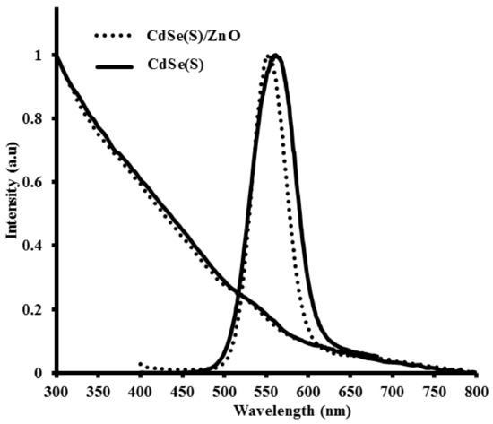 As-synthesized CdSe(S) and CdSe(S)/ZnO QDs had strong emissions under UV light (Supplementary Materials Data S7) with narrow emission peaks at 560 and 550 nm for CdSe(S) and CdSe(S)/ZnO QDs, along with broad excitation bands starting at 530 nm for CdSe(S) and 520 nm for CdSe(S)/ZnO QDs, respectively (Figure 3). The wide band absorption and narrow emission of QDs are mainly related to the specific structure of QDs. The structure of QDs is intermediate between bulk semiconductor and atoms. In bulk semiconductors, the atomic orbitals overlap to form continuous energy levels in both the valance band (VB) and conductive band (CB). Electrons then occupy all of the states up to the edge of the VB, whilst the electronic states in the CB are almost empty and only occupied by thermal excitation across the energy gap (Eg). In semiconductor QDs, the energy states are quantized due to quantum confinement effects. In QDs, when a photon has an excitation energy exceeding the semiconductor band gap, the QD may absorb the photon, creating an excited electron in the CB, resulting in a wide-band absorption, usually in the UV-visible region [69]. The excited electron can relax to its ground state by the emission of another photon with energy equal to the band gap, resulting in a narrow and symmetric emission known as photoluminescence (PL) [70,71]. UV-Vis spectra of CdSe(S) and CdSe(S)/ZnO QDs both had long tails, extending into the near-infra-red (NIR) region, along with weak first excitation bands. The reason can be attributed to defect states that energetically lie within the band gap. However, due to the small Stokes shift, these defects do not contribute to the emission pathway.