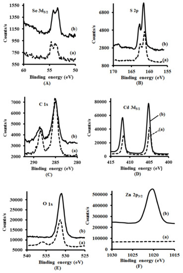 The XPS spectra of both CdSe(S) and CdSe(S)/ZnO QDs (Figure 4), confirmed the existence of the peaks assigned to Se 3d5/2 at 52 eV, Cd 3d5/2 at 404 eV, S 2p at 161.8 eV, O 1s at 532, and three C 1s peaks at 284.5, 286.5, and 288.5 eV, indicating that the shell growth does not influence the structure of CdSe(S) QD cores. Meanwhile, XPS data of CdSe(S)/ZnO QDs showed a peak at 1022 eV assigned to Zn 2p3/2, as evidence for existence of zinc in the structure of CdSe(S)/ZnO core/shell QDs. The peak characteristics of S 2p at 161.8 eV in the XPS data of the QDs is in agreement with previous reports in the literature, where MPA releases sulfur at high temperature [73,74], resulting in sulfur from the 3-mercaptopropionic acid (MPA) participating in the growth of CdSe(S) particles. Indeed, XPS data of CdSe(S)/ZnO QDs confirmed the existence of both Zn and O in the core/shell CdSe(S)/ZnO QDs, with the observation of a new peak related to Zn 2P3/2at 1022 eV (Figure 4F), indicating the formation of a ZnO shell around the CdSe(S) cores; this is consistent with the standard X-ray photo electron spectrum of ZnO [75] and is in accord with previous work [50].