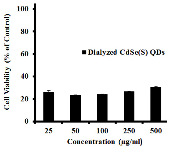 A total of twenty different solutions of CdSe(S) and CdSe(S)/ZnO QDs, Cd-MPA (Sample 1, Supplementary Materials Data S1), and Cd-Se-MPA (Sample 2, Supplementary Materials Data S1) were prepared by diluting the aqueous solutions with ultra-pure water to achieve concentrations of 25, 50, 100, 250, and 500 µg/mL. Each sample was used in cytotoxicity assays without further purification. In order to remove excess cadmium ions and capping agent from the aqueous solution, a Slide-A-Lyzer dialysis cassette (ThermoFisher Pty. ltd., VIC, Australia) was used in the QD stock solution and the cytotoxicity of dialyzed CdSe(S) QDs in the presence of HCT-116 cell line was investigated in five samples at concentrations of 25, 50, 100, 250, and 500 µg/mL.