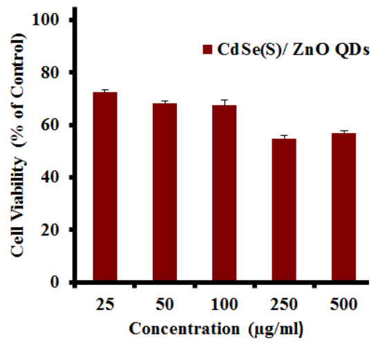 The results of cytotoxicity assays of CdSe(S)/ZnO core/shell QDs towards human colorectal carcinoma cells (HCT-116). Error bars indicate standard error of the mean and cell media without treatment with QDs was used as a control.