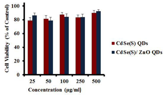 Human skin fibroblast (WS1) cells were used to determine the cytotoxicity of the as-synthesized QDs towards normal, resilient cells. The results showed that both CdSe(S) and CdSe(S)/ZnO QDs exhibited low toxicity at all of the concentrations studied (Figure 8), whilst the viability of HCT-116 cells was significantly decreased after incubation with both CdSe(S) and CdSe(S)/ZnO QDs at all concentrations (Figure 6 and Figure 7). This indicates that cell resistance is another important factor in cytotoxicity assessments.
