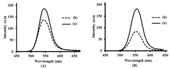 Photoluminescence spectra of CdSe(S) QDs (A) and CdSe(S)/ZnO QDs (B): (a) in water and (b) in cell media. The excitation wavelength of the instrument was adjusted at 405 nm at the time of measuring the photoluminescence (PL).
