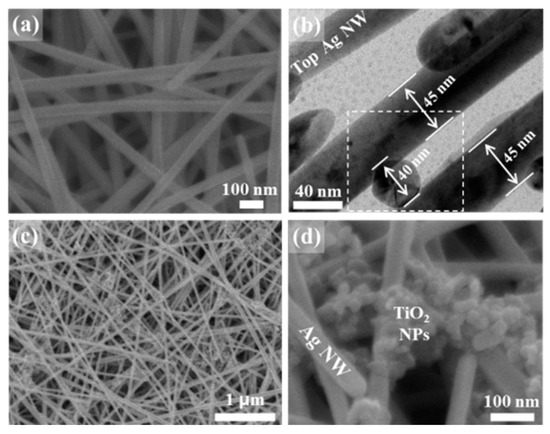 (a) SEM and (b) TEM images of 3D stacked Ag NWs. (c,d) SEM images of 3D hybrid nanostructures consisting of TiO2 NPs and 3D Ag NWs. The image clearly shows the compact integration of TiO2 NPs onto the crossed region of the 3D Ag NWs.