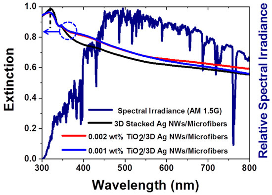 Figure 2 presents the extinction spectra of 3D plasmonic Ag NWs and 3D TiO2/Ag hybrid nanostructures prepared with different TiO2 concentrations (see Figure S2 for the extinction spectra of the bare microfiber filters and TiO2 NPs). The microfiber substrate deposited using 0.01 wt% TiO2 NPs exhibited a very low extinction in the visible region but a very high UV extinction below 400 nm. These results indicated the presence of UV light–TiO2 semiconductor interactions near the band gap of crystalline TiO2 [26]. The green tangent line indicates 388 nm, the band gap energy (3.2 eV) of the anatase TiO2 (Figure S2). The 3D Ag NWs exhibited strong interactions from the UV to the visible region (black line in Figure 2). The highest extinction near 326 nm was attributed to an interband transition (3.8 eV) of Ag. The 3D stacked Ag NWs also had a high extinction across the entire visible wavelength range. The 3D hybrid nanostructures possessed higher extinction than the 3D stacked Ag NWs in visible region. The high extinction of the 3D hybrid nanostructures agreed well with the high intensity of visible light under standard AM 1.5G solar illumination (navy line in Figure 2). Therefore, the 3D hybrid nanostructures were expected to increase the photocatalytic activities through enhanced light–matter interactions.