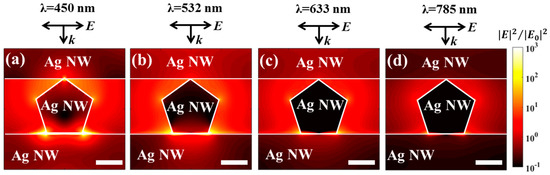 Numerical simulations were carried out using finite difference time domain analysis (FDTD) techniques. In these simulations, transverse magnetic polarized incident waves with different wavelengths (450 nm, 532 nm, 633 nm, and 785 nm, respectively) were applied to the crossed Ag NW nanostructure. The simulation was simplified by including three crossed Ag NWs (the upper and lower NWs were perpendicular to the central NW). The Ag NWs were modeled as five-sided equilateral pentagons, and the radius of the pentagon was fixed at 25 nm. The mesh size was set to 0.2 nm around the junction of the crossed Ag NWs. Perfectly matched layer (PML) formulation was applied in all directions. The complex permittivity of Ag was adopted from Reference [19].