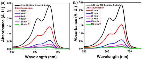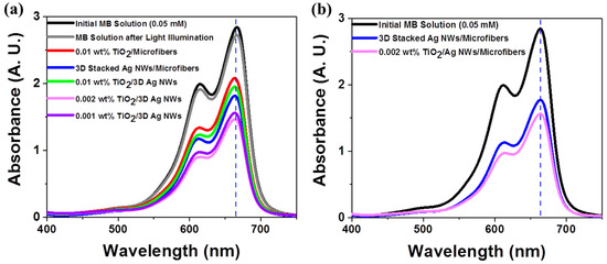The 3D composite nanostructures composed of 0.002 wt% TiO2 and 3D Ag NWs were examined in time-dependent MB degradation studies under different light illumination conditions. The changes in the UV-visible spectra during photodegradation are shown in Figure 5. The main absorption peak of MB at 665 nm decreased markedly with the irradiation time (up to 60 min) and almost vanished after 90 min (Figure 5a). After 90 min of irradiation, the blue color of the initial MB solution became transparent due to the photodecomposition of MB molecules. We observed almost the same photocatalytic performance in the presence of the 3D composite under visible light illumination (λ > 400 nm), as shown in Figure 5b. The 3D composite performed effectively under both full spectral and visible spectral (λ > 400 nm) illumination.