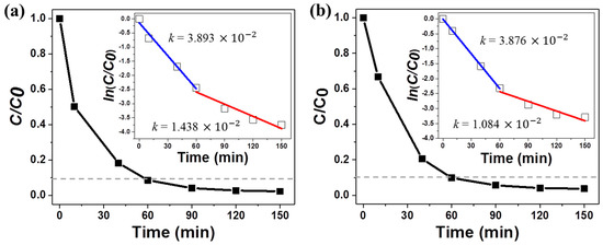 The photocatalytic efficiencies of the 3D composite nanomaterials are illustrated in Figure 6. C0 is the initial concentration of MB, and C is its concentration after each irradiation time. About 90% of the initial MB concentration was photodegraded under UV/visible and visible illumination after 60 min. The rate of MB degradation decreased after 60 min. This decrease was attributed to the fact that the substrate was placed at the bottom of a petri dish, and the MB molecules in the aqueous solution were randomly dispersed throughout the 10 mL volume during illumination. The dilution of intact MB molecules decreased the rate of collision between the organic molecules and the active site. The diffusion-limited behavior of the dye molecules required longer illumination times to achieve total decomposition of the organic dyes. Due to the diffusion-limited behavior, we divided the photocatalytic kinetics into two stages: before 60 min and after 60 min. The photodegradation process was assumed to follow Langmuir–Hinshelwood kinetics, ln (C/C0) = −kt, where C is the MB concentration as a function of the photodegradation time (t), C0 is the initial concentration, and k is the reaction rate constant (insets of Figure 6) [41,42]. The rate constant obtained under UV-visible illumination was measured to be 3.893 × 10−2 min−1 during the initial stage and decreased to 1.438 × 10−2 min−1 after 60 min (Inset of Figure 6a). Under visible light illumination, the values of k were found to be 3.876 × 10−2 min−1 and 1.084 × 10−2 min−1, respectively (inset of Figure 6b).