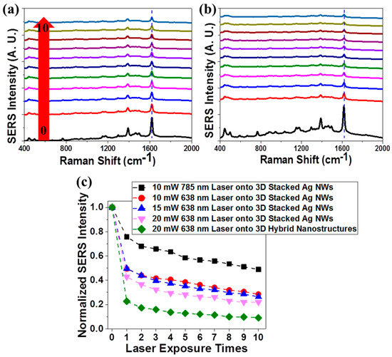 SERS intensity changes in the MB deposited onto (a) 3D stacked Ag NWs structures and (b) 3D hybrid (0.002 wt% TiO2/Ag NWs) nanostructures during 638 nm laser exposure (10 s). The SERS measurements were performed by illuminating with a 638 nm laser for only 0.01 s to avoid photocatalytic effects. (c) The overall SERS intensity changes at 1620 cm−1 in MB molecules under different illumination conditions.