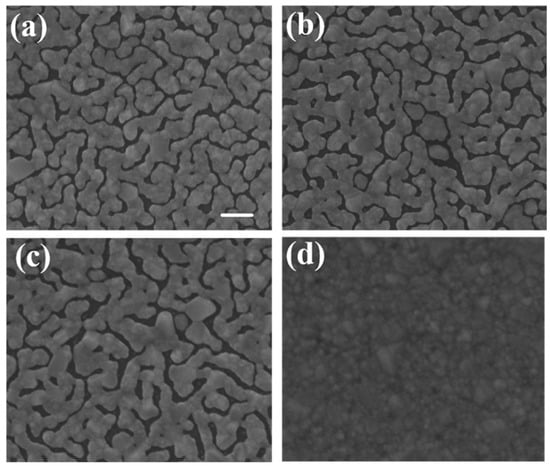 SEM images of sliver film with thickness of 30 nm deposited on flat substrate by thermal evaporation at rates of (a) 1.2 Å/s, (b) 2.4 Å/s, and (c) 3.6 Å/s, labeled as sample A, B, and C, respectively. (d) Flat silver film with thickness of 30 nm deposited by E-gun evaporation. Scale bar: 100 nm.