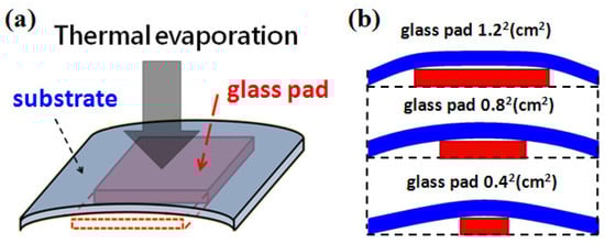 (a) Schematic diagram of substrate with glass pad underneath during thermal evaporation. (b) Bending geometry with glass pads in different sizes, the maximum curvature occurs around the corners of the underneath glass pad.