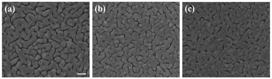 SEM images of sliver films with thickness of 30nm deposited on bent substrates using a fixed thermal evaporation rate at 1.2 Å/s with (a) glass pad area 1.22 cm2, (b) glass pad area 0.82 cm2, and (c) glass pad area 0.42 cm2 underneath, respectively. They are labeled as sample D, E, and F, respectively. Scale bar: 100 nm.
