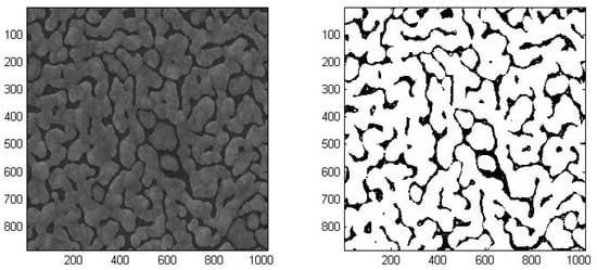 Schematic diagram of SEM image reconstruction. The figure on the left is the original SEM image and the figure on the right is the reconstructed binary image. The numbers on the axes are in nanometer.