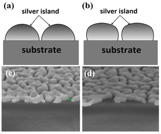 After a carefully analysis of the data, we find other factors may also influence the enhancement effect which might be the reason of the unexpected results. Sample A and D had similar gap densities but the gaps on sample D were narrower. However, the Raman signals from sample D is not higher than that from sample A. Here we propose three possible reasons. One is the coupling efficiency difference due to the dissimilarity in geometry shape of the silver islands developed by the two methods. The excitation of surface plasmon is due to the scattering from topological defects on the surface, which are the sub-wavelength gaps. If we consider the boundary contours of the cross-sections of the islands developed by the two methods, the contour of the island deposited without glass pad underneath is relatively closer to a semicircle as schematically shown in Figure 9. While the island developed with substrate bending does not have such a smooth circular contour. The semicircular contour may have a better coupling efficiency for plasmons. The cross-section SEM images of the samples also reveal the difference in three-dimensional shape of the nano-islands developed using the different methods. Figure 9c is the cross-section SEM image of sample A. The shape of islands is closer to a semicircle with a smaller contact angle with the substrate. However, the shape is more oblate for sample D and the contact angle is larger as seen in Figure 9d. Secondly, the change in nano-island shape and film morphology would induce shift in resonance frequency, which might result in reduced signal. The third possible reason is that the buried mechanical strain on the silver island film due to substrate flattening might mitigate the SERS effect. There are some recent studies using strain or deformation of nanoparticle to alter the LSPR strength [23,32]. This is an interesting topic of research, and may require further investigation.