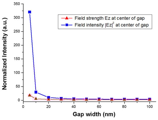 In order to understand the enhancement due to gap width and ratio change, we used a metal–insulator–metal (MIM) nano-structure model to simulate the electrical field on the silver island film. Because of the irregular shape of the silver islands, it is difficult to quantify the geometry of the structure. There were very limited simulation works specifically for silver island films. The schematic for our simulation was illustrated in Figure 10. We used metal bars with a height of 30 nm to simulate the silver islands. The width of the metal bar was determined by the analyzed SEM image. By varying the size of the gap in between, we investigated the field strength at the center of the gap. The calculated TM electrical field (Ez) strength and intensity is shown in Figure 11. A clear trend of exponential increase in the field strength as the gap size reduces is seen in the figure. At a gap size of 10 nm, the field intensity is enhanced about 30-fold, which corresponds to a SERS enhancement of about 103. However, with a gap size smaller than 10 nm, the field intensity can be enhanced more than 300-fold, which would lead to a SERS enhancement factor of 105. Therefore, we can expect greatly enhanced SERS signal from these reduced nanogaps. The trend of enhancement was in accordance with what we have observed in the experiment.