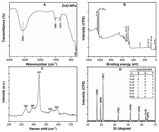 Characterization of the zinc oxide nanoparticles (ZnO NPs) powder (A) FT-IR; (B) X-ray photoelectron spectroscopy (XPS) survey spectrum; (C) Raman spectrum; (D) XRD spectra expressed in arbitrary units and counts per second.