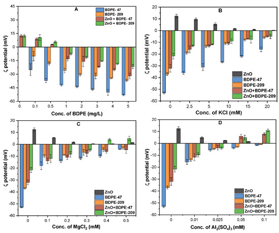 Figure 2 presents the effects of both PBDPEs on the ζ potential of ZnO NPs (10 mg/L) at pH 7 in the absence and presence of the electrolyte. As indicated in Figure S1B of the Supplementary Information, the ζ potential of ZnO NPs was +12.6 mV, while the isoelectric point (pHiep) was observed to be approximately 9.2, which is consistent with previous studies [38,39]. The ζ potential of ZnO NPs became negative upon the addition of BDPE-47 and BDPE-209 (Figure 2A). It is noteworthy that the higher concentration of both PBDPEs resulted in a further decrease in ζ potential (more negative) of the ZnO NPs. For example, the significant decrease in surface charge of ZnO NPs in the presence of 5 mg/L of BDPE-47 and BDPE-209 was found to be −33.2 and −27.1 mV, respectively. However, the ζ potential of 5 mg/L BDPE-47 and BDPE-209 in DI water was observed to be −50.0 and −42.8 mV, respectively (Figure 2A).