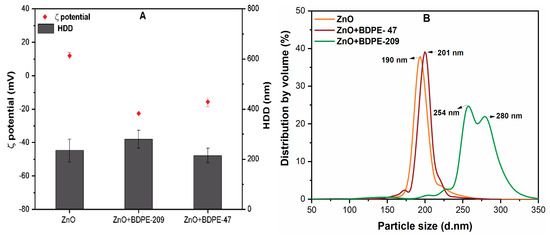 (A) Hydrodynamic diameter (HDD) of ZnO NPs (10 mg/L) with and without PBDPEs (5 mg/L) in DI water; (B) distribution by volume (%) of ZnO NPs in the presence of (5 mg/L) of BDPE-47 and BDPE-209 at pH 7.