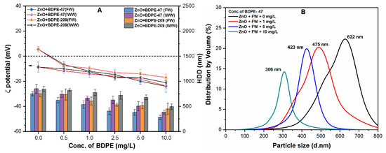 (A) The ζ potential and HDD of ZnO NPs coated with different concentrations (0–10 mg/L) of both BDPEs in freshwater (FW) and industrial wastewater (IWW); (B) size distribution of ZnO NPs with various BDPE-47 (0, 1, 5, and 10 mg/L) concentrations in FW.