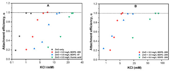 The stability of ZnO NPs was further explored by measuring the CCC of KCl for ZnO NPs in the absence and presence of PBDPEs in aqueous media (Figure 6). The energy barrier among the particles is diminished at CCC and electrolyte concentrations above CCC, and hence promotes the diffusion-controlled aggregation. The commonly used DOM substitute humic acid (HA) was used to compare the NPs stability with PBDPEs. Different diffusion-limited agglomeration (DLA) and reaction-limited agglomeration (RLA) regimes were found in the absence and presence of both PBDPEs (Figure 6). The CCC of KCl for ZnO NPs in the absence of PBDPEs was found to be 1.3 mM. This has practical implications in natural waters with IS (1–15 mM), suggesting the rapid settling of ZnO NPs in those environments [10,14]. Moreover, increasing IS weakens the electrostatic repulsion forces and increase the attractive forces among the NPs, thereby enhance the sedimentation due to an increase in attachment efficiency [34,45]. Upon the addition of 0.5 mg/L BDPE-47 and BDPE-209, the CCC of ZnO NPs increase to 6.8 and 11.7 mM KCl, respectively, which indicate the enhancement in stability of ZnO NPs in the presence of PBDPEs (even at low concentrations). This may be attributable to the surface coating of organic pollutant onto NPs increasing the steric hindrance, thus reducing the compression-induced effect of electrolytes [46]. Compared with organic pollutants, the HA increases the CCC of KCl for ZnO NPs two-fold, i.e., 32 mM. These results are in good agreement with previous [13,36,39] that affirm that high molecular weight (HMW) compounds such as HA have higher affinity of sorption onto NPs, due to the presence of several aliphatic and aromatic groups. These results are also consistent with our previous DLS observation, where BDPE-209 shows an insignificant effect on the aggregation of NPs for concentration up to 5 mg/L (Figure S5). Thus, further experiments were conducted to quantify the effect of different concentration of BDPE-209 on the CCC of KCl for ZnO NPs (Figure 6B). The slight increase in CCC was observed to be 20 mM KCl at 3 mg/L BDPE-209 concentration; the CCC becomes 78 mM when the BDPE-209 concentration reaches 6 mg/L. Similar behavior has been observed in the kinetic aggregation study, where the stability of ZnO NPs was significantly increased above 5 mg/L BDPE-209 concentration (Figure S5C). In general, such observations suggest that PBDPEs might improve the colloidal stability of ZnO NPs in the heterogeneous aqueous environment.