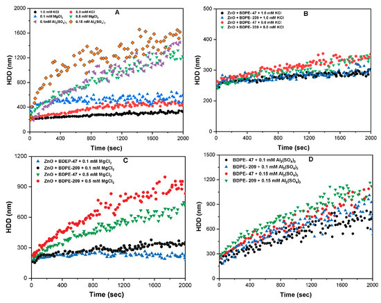 To further understand the effect on the aggregation behavior of ZnO NPs in the presence of various cations and PBDPEs, additional experiments were performed (Figure 7). The aggregation kinetics and rate (ka) of ZnO NPs at 1 and 5 mM KCl were found to be 320 and 430 nm, and 7.2 and 12.9 nm/min, respectively (Figure 7A and Figure S6). This might be related to the closeness to the value of CCC of ZnO NPs for KCl; thus, most of the NPs are unstable under these conditions. Similar observation was reported in an earlier study [23,39], where enhanced agglomeration was observed in the presence of K+, as depicted by the larger HDD of NPs. In contrast, lower concentration of MgCl2 (0.5 mM), Al2(SO4)3 (0.15 mM) significantly destabilized the NPs in solution, as described by their higher HDD (1250, 1600 nm) and ka (89.3, 92 nm/min) values (Figure 7A and Figure S6B,C). These results are in good agreement with the recent study [10,38], that demonstrated the greater charge screening ability of polyvalent cations, thus effectively destabilizing the NPs in suspension.