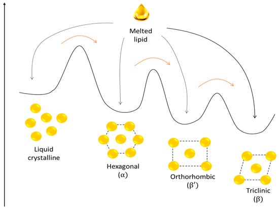 Schematic representation of the energy landscape of different lipid structures and possible polymorphic transformations. Black arrows represent crystallization process after nanoparticle formation; different structures can be formed in the same process. Red arrows represent spontaneous crystal structure transformation during nanoparticle storage.