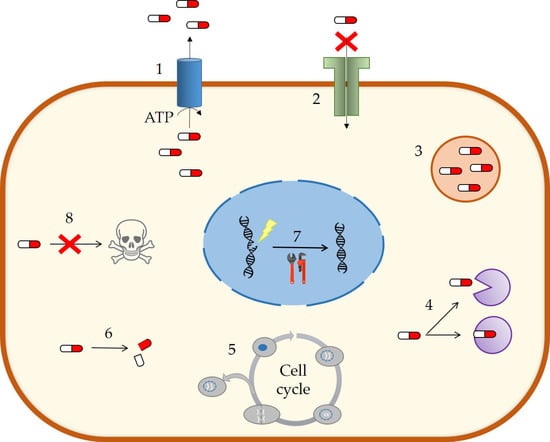 Cellular MDR are divided into several mechanisms (Figure 4). Nevertheless, the best characterized and with the greatest contribution to MDR development is the efflux caused by the overexpression of some membrane transporters as a consequence of exposure to cytotoxic drugs [46,47].