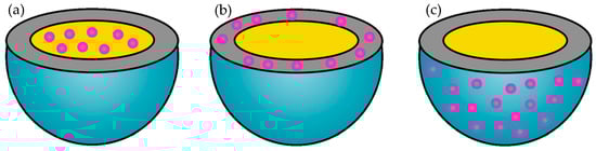 Drug distribution in solid lipid nanoparticles. Possible ways of incorporation of a drug (pink) in a SLN: (a) homogeneous dispersion in the lipid matrix, (b) incorporation in the shell of the matrix, or (c) distribution in the outer shell.