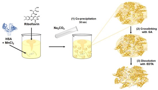 The RF-HSA-MPs were fabricated using a modified protocol based on the previously described CCD-technique [17,18]. Briefly, 20 mL of MnCl2 solution containing 10 mM RF and 10 mg/mL HSA were mixed in a 100 mL beaker for 1 min. Then 20 mL of Na2CO3 were added rapidly under vigorous stirring (Bibby Scientific CB161 Magnetic Stirrer, level 3) for 30 s at room temperature (final concentrations of RF and HSA were 5 mM (≈1.9 mg/mL) and 80 µM (5 mg/mL), respectively). The final concentration of MnCl2/Na2CO3 varied from 0.0625 to 0.25 M with a constant RF solution and HSA concentration. The hybrid particles obtained were separated by centrifugation at 3000× g for 3 min and washed twice with a 0.9% NaCl solution. The particles were suspended in a GA solution (final concentration 0.1%) and incubated at room temperature for 1 h, followed by centrifugation at 3000× g for 3 min. The remaining unbound aldehyde groups of GA in the particles were quenched using 0.08 M glycine and 0.625 mg/mL NaBH4, and the MnCO3 template was subsequently removed by treatment with EDTA solution (0.25 M, pH 7.4) at room temperature for 30 min. Finally, the resulting particles were centrifuged, washed until the washing solution became colorless, and resuspended in Ampuwa® for further use. The fabrication scheme of the submicron particles is shown in Figure 1.