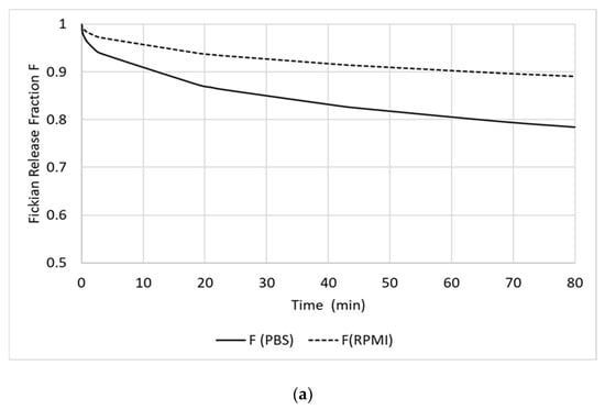 The investigation of the drug release was performed using a dialysis-bag diffusion method against PBS pH 7.4 as well as RPMI 1640 medium. The cut-off of the dialysis bag allowed the free diffusion of released RF through the semi-permeable membrane from the solution inside the dialysis bag to the outside following the concentration gradient. The results of the in vitro release of RF from RF-HSA-MPs are shown in Figure 4a. The decrease of the RF concentration remaining in the particle suspensions was followed for 80 h. It can be seen that the drug release profiles, in both investigated media, are bi-phasic with an initial burst release of approximately 7% in PBS and 12% in RPMI from the initial RF concentration during the first 2 to 3 h. Thereafter, the release rate decreased and a sustained release was observed until the end of the experiments. After 80 h the drug release remained 30% and 45% of the initial loading in PBS and in RPMI, respectively.