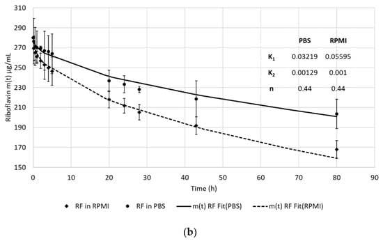 The release profiles of RF in PBS pH 7.4 and in RPMI 1640 medium were displayed as time dependency for the remaining RF concentration in the RF-HSA-MPs and fitted with the release model of Pappas [29], Equation (1) was used: