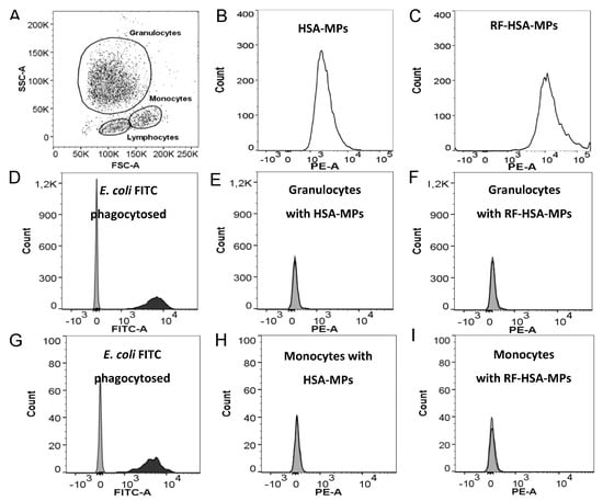 Phagocytosis assay showing (A) three groups of white blood cells identified by their forward scatter (FSC) and side scatter (SSC): granulocytes, monocytes, and lymphocytes. Histograms representing fluorescence intensity of (B) HSA-MPs and (C) RF-HSA-MPs in the PE-A channel. Phagocytosis of FITC-labeled opsonized E. coli in granulocytes (D) and monocytes (G) (grey area: negative controls incubated at 0 °C; black area: granulocytes and monocytes with phagocytosed FITC E. coli). Representative histograms of fluorescence intensity of monocytes and granulocytes after interacting with (E,H) HSA-MPs and (F,I) RF-HSA-MPs (grey area: negative controls incubated at 0 °C; black line: granulocytes and monocytes incubated at 37 °C MPs; k stands for kilo). Data are representative of n = 3 independent phagocytosis assays showing the same trends.